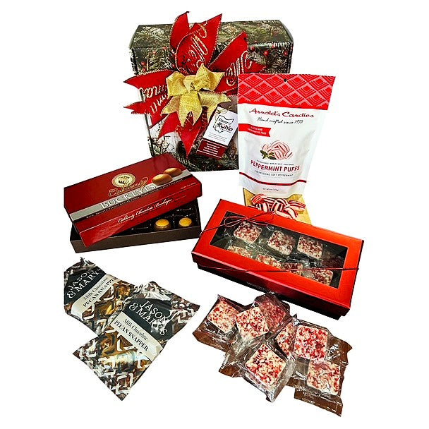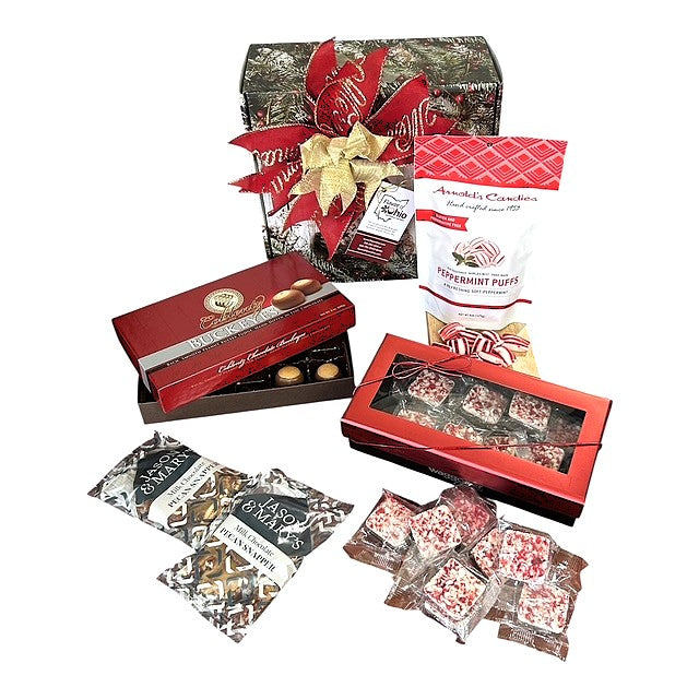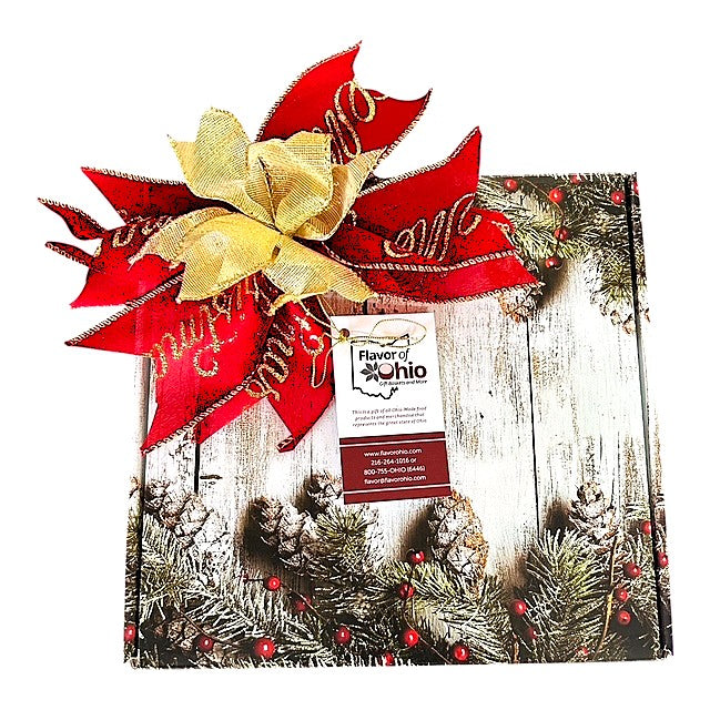 Indulge in the festive flavors of our Buckeye & Peppermint Wonderland. This charming rustic winter box, 9x9x4, pictures holly and pine cones tied with a homemade bow. Perfect for holiday gifting, It combines classic treats with elegant packaging to brighten any celebration.