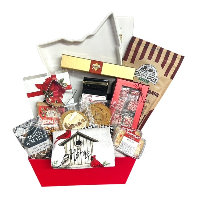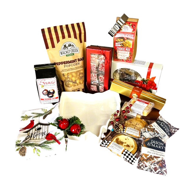 Inside, they'll discover an assortment of Ohio-made candies, rich chocolates, creamy fudge, & festive cookies, complemented by a cardinal-themed tea towel symbolizing beauty & cheer during the winter season.