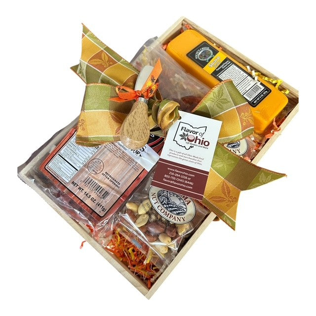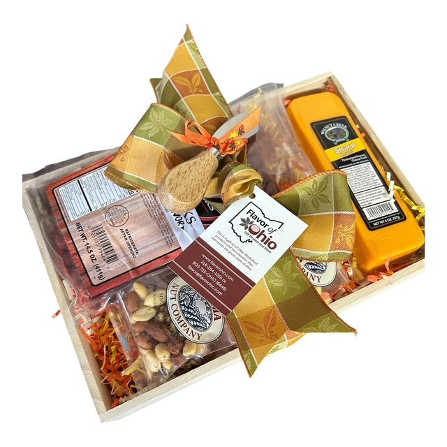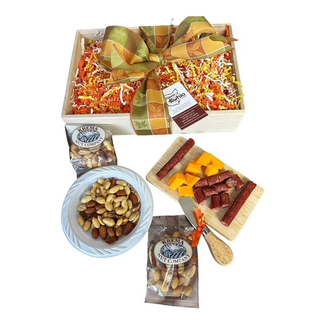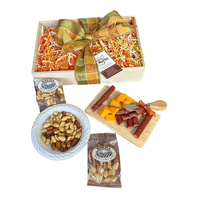 Celebrate Fall with a crate packed full of fun! Enjoy 15 savory meat snacks, a selection of cheeses and nuts, plus a cute cheese cutter—all wrapped up perfectly. It’s the tastiest way to say thanks to your host or hostess while sharing Ohio’s flavors. A playful gift that’s as delicious as it is thoughtful!